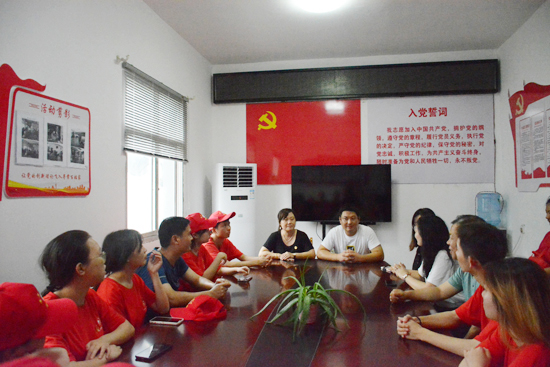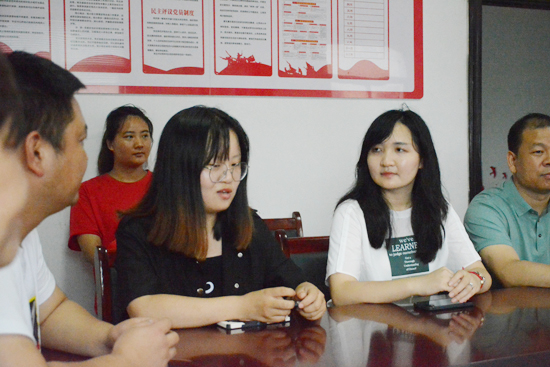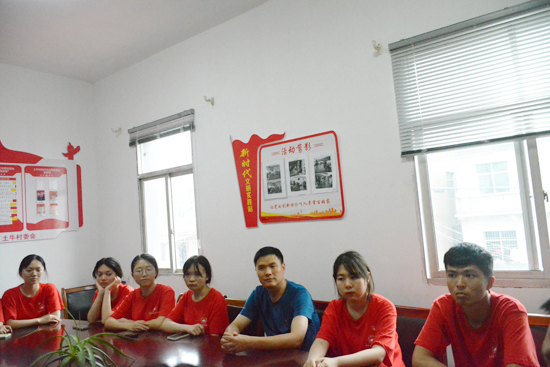到达目的地后,映入眼帘的便是土牛村党群服务中心二层小平房上“为人民服务”、“不忘初心,牢记使命”的醒目大字。在红色党旗下,土牛村两位党员同志上前为服务队队员们介绍土牛村党史,热情回答队员们各种基层党建的问题,展现出基层党员们不畏苦难,一心为民的无私奉献精神。土牛村现在总共有中国共产党党员45名,其中25名固定党员,20名流动党员。固定党员服务于土牛村党群服务中心,解决工作中所遇到的实际困难;流动党员一般通过中心建立的微信群主动联系家乡的固定党员获取家乡的各种消息,他们心里有家乡,脑中想着家乡,时时刻刻准备为家乡建设贡献自己的力量。此外,服务中心坚持向每位党员输入红色思想,为保证基层党员“思想不掉队,行为有准则”付出艰苦努力。这一点深刻体现在党日活动举办的多样性上,如组织党员参观烈士陵园、红色故迹,播放红色党史教育视频等等。