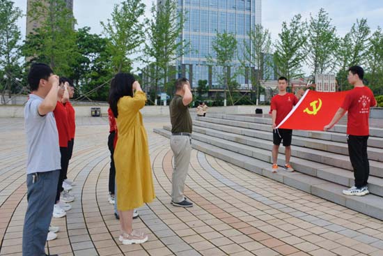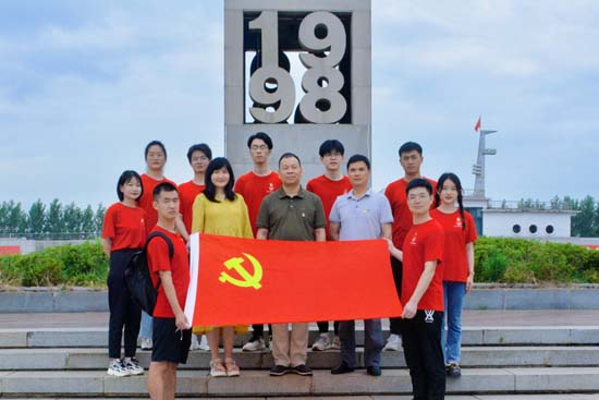 服务队师生来到九八抗洪广场镂刻着“1998”的纪念碑前,党员师生面对党旗,在陈永钊的带领下重温了入党誓词。