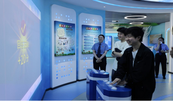 活动伊始,在检察干警的引导下,参观人员首先来到了一楼12309检察服务中心。工作人员详细介绍了中心受理民事申诉、支持起诉等职能,展现了检察机关司法为民的窗口形象。随后,大家来到二楼。“现在您看到的是我们的青少年法制教育基地......"智能机器人小阳正为参观者讲解展区内容。AR技术带来的“危险驾驶体验”让师生们直呼震撼。“通过虚拟现实技术,我们让普法教育从'说教式'转变为'体验式'。”检察官介绍道。基地内,互动答题区、模拟法庭等特色板块,将枯燥的法律条文转化为生动实践。同学们亲身体验了法治教育的趣味性与实用性,深刻感受到检察机关在普法宣传中的创新实践。