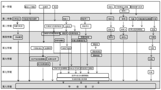学制四年。学生在学期间必须修满培养方案规定的145 学分方能毕业,其中综合教育课程 52.5 学分,专业基础课程12 学分,专业课程 62.5 学分(专业必修课50.5 学分,专业选修课12 学分),实践教学环节16 学分(不含课内实践),第二课堂2 学分。达到学位要求者授予法学学士学位。