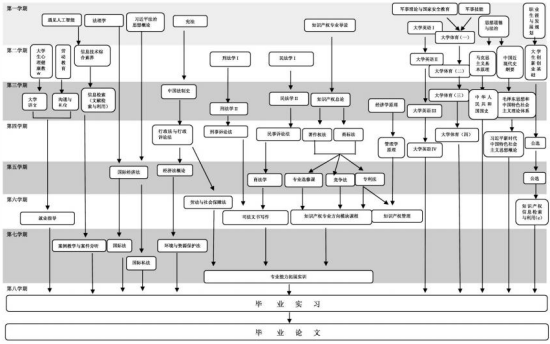 著作权法、商标法、专利法、竞争法、法理学、宪法、民法、刑法、刑亊诉讼法、民亊诉讼法、行政法与行政诉讼法、商法、中国法制史、经济法、国际经济法、劳动与社会保障法、经济学原理、管理学原理、知识产权总论、知识产权管理实务、商标法实务、专利法实务、知识产权文献检索与利用等。