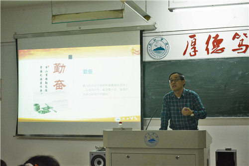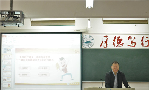 陈永钊以“做担当民族复兴大任的时代新人”为主题,从如何学习、如何生活、如何做人三个方面进行了阐述。在学习方面,他指出要明确大学生活与高中生活的区别,学会自主学习。同时强调我们要珍惜时间,规划好自己的大学生活,努力学习专业知识,为将来司法考试和研究生考试作准备。在生活方面,他指出要积极参加社团活动,不断培养和提升自己的交往能力,充分利用第二课堂拓展自己的能力素质。在做人方面,他指出在自媒体时代,多元价值观悄然地浸透大家的生活,因此同学们要提升自己明辨是非的能力,他呼吁大家要做社会主义接班人和建设者,坚定自己的政治信仰,坚定地信仰马克思主义。