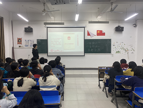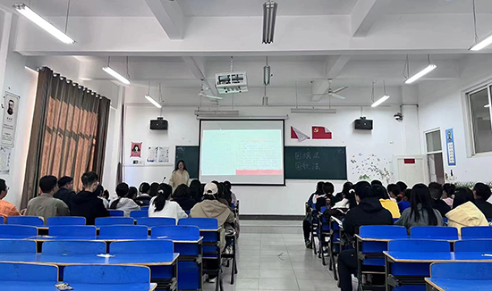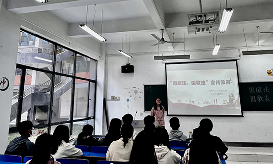 活动在全体同学的阵阵国歌声中拉开了序幕,团支书们通过PPT讲解、放映视频等形式向大家讲述了国旗图案含义、国歌规定等内容,同学们踊跃参与,相互交流讨论,加深了对国旗法、国歌法的理解。