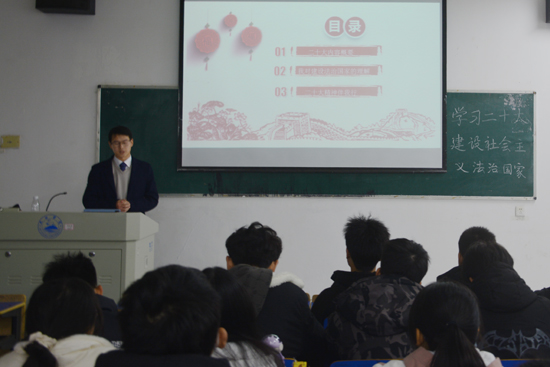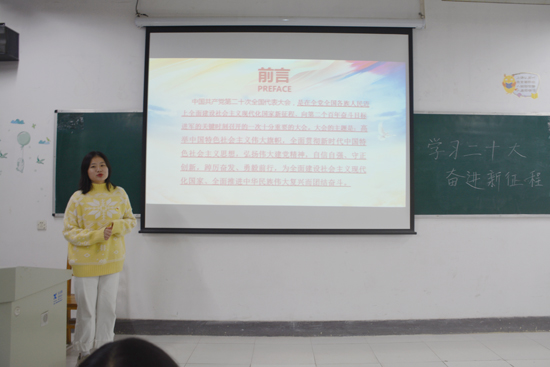 侯安琪从“二十大内容概要”、“我对二十大乡村振兴的理解”、“二十大精神伴我行”三个方面做了“踔厉奋发二十大,砥砺迈向新征程”主题宣讲报告。通过提问互动、插播视频、举例说明等形式,向同学们讲述了中国共产党过去5年的工作和新时代10年的伟大变革。