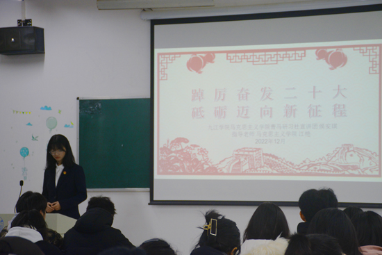 王瑶以生动的语言通过四个部分阐述了党的二十大精神:一、新时代十年的伟大变革和历史成就;二、开辟马克思主义中国化时代新境界;三、新时代新征程中国共产党的使命任务;四、新时代大学生的时代要求。整个宣讲条理清晰,层次分明。