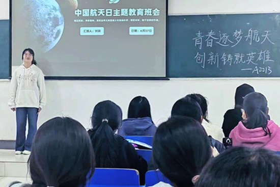 活动伊始,同学们观看中国航天事业发展历程视频,共同回顾了中国载人航天发展之路,了解我国航天事业所取得的辉煌成就,学习了“热爱祖国、勇于攀登、科学求实、严肃认真、淡泊名利、默默奉献”的中国航天精神。活动最后,各班级团支部书记呼吁同学们将“航天精神”中蕴含的以爱国主义为核心的民族精神和以改革创新为核心的时代精神发扬光大,将“航天精神”融会贯通到专业实践中去,不辱使命,无悔青春。