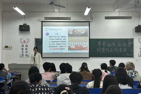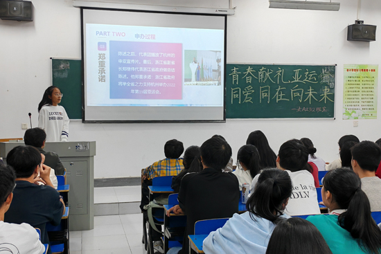 亚运会承载着亚洲人民对和平、团结、包容的美好向往。此次团日活动的内容围绕走进杭州第19届亚运会、知晓亚运会申办过程、弘扬亚运精神奋进新时代等方面展开。同学们观看了亚运会宣传片,展示了亚运会的会徽、吉祥物、火炬和奖牌等,感受了亚运会的“中国特色、亚洲风采、精彩纷呈”。各班级团支部书记向同学们讲述了亚运会申办过程,并带领同学们学习了亚运精神。