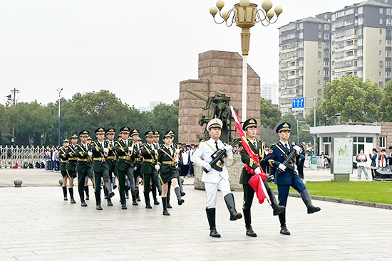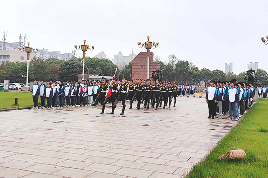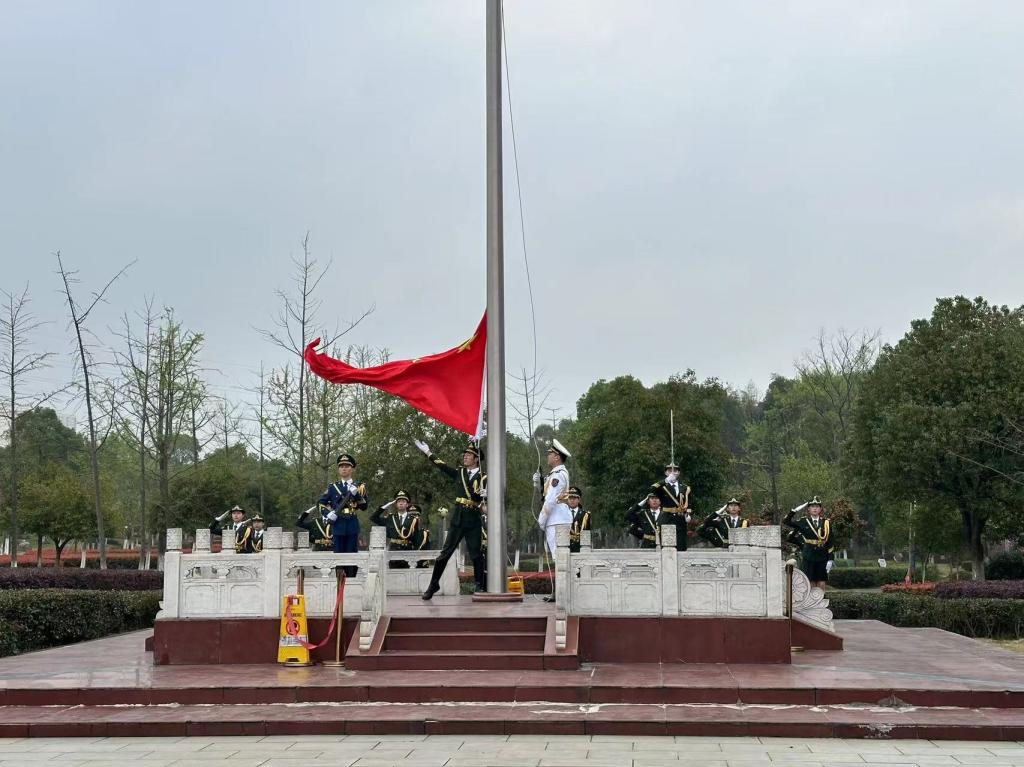 国旗队迈着沉稳有力的步伐护送国旗至升旗台,擎旗手昂首阔步走向旗杆,迎风振臂,在空中展开国旗。在雄壮的歌声中,鲜艳的五星红旗冉冉升起,全体学生面向国旗行注目礼。升旗仪式结束后,同学们集体朗诵《沁园春·长沙》《沁园春·雪》,郎朗书声中,体现了青年人的蓬勃朝气。