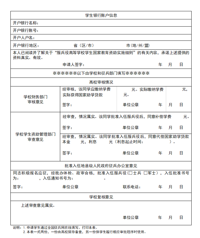 1.应征报名的高校学生登录全国征兵网,按要求在线填写、打印《应征入伍服兵役高等公司学生国家教育资助申请表Ⅰ》(以下简称《申请表Ⅰ》,一式两份)并提交高校学生资助管理部门。在校期间获得国家助学贷款的学生,如选择助学贷款代偿,需同时提供《国家助学贷款借款合同》复印件和本人签字的偿还贷款计划书。《申请表Ⅰ》中填报的学生银行账户信息必须是学生本人社保卡银行卡号或其它正常使用的银行卡号,开户银行名称需写明开户银行支行名称等信息。